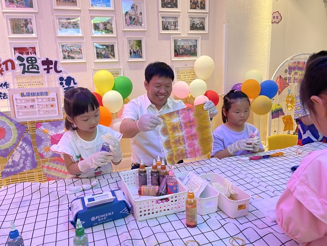 劉顯清一行先后走進(jìn)兩所幼兒園的班級教室、美術(shù)教室、多功能廳,參觀了活動環(huán)境,來到孩子們身邊,觀看了“國學(xué)擂臺賽”“國風(fēng)時裝秀”“足球小將”等豐富多彩的迎“六一”活動,并參與了游戲項目“初遇扎染”,和孩子們一起歡慶節(jié)日。