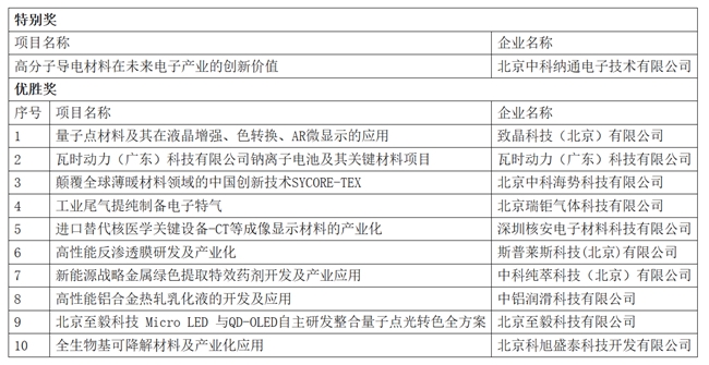 決賽評(píng)審團(tuán)由具備深厚行業(yè)背景與實(shí)踐經(jīng)驗(yàn)的專家組成,從技術(shù)可行性、市場前景、商業(yè)模式等多維度,對(duì)參賽項(xiàng)目進(jìn)行了專業(yè)點(diǎn)評(píng)與指導(dǎo)。經(jīng)過激烈角逐,高分子導(dǎo)電材料在未來電子產(chǎn)業(yè)的創(chuàng)新價(jià)值項(xiàng)目獲得了本次大賽的特別獎(jiǎng),量子點(diǎn)材料及其在液晶增強(qiáng)、色轉(zhuǎn)換、AR微顯示的應(yīng)用等10個(gè)項(xiàng)目獲得優(yōu)勝獎(jiǎng)。