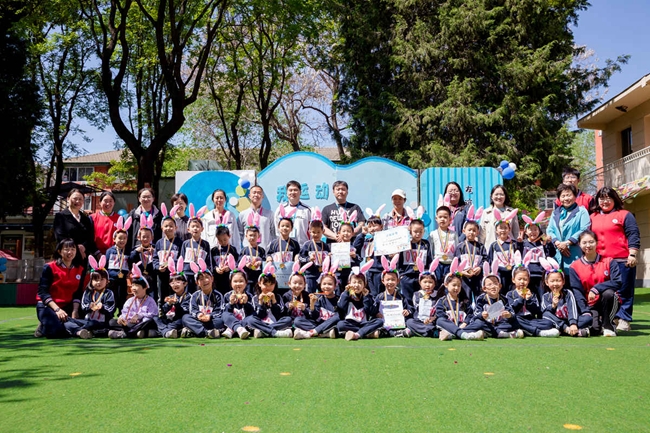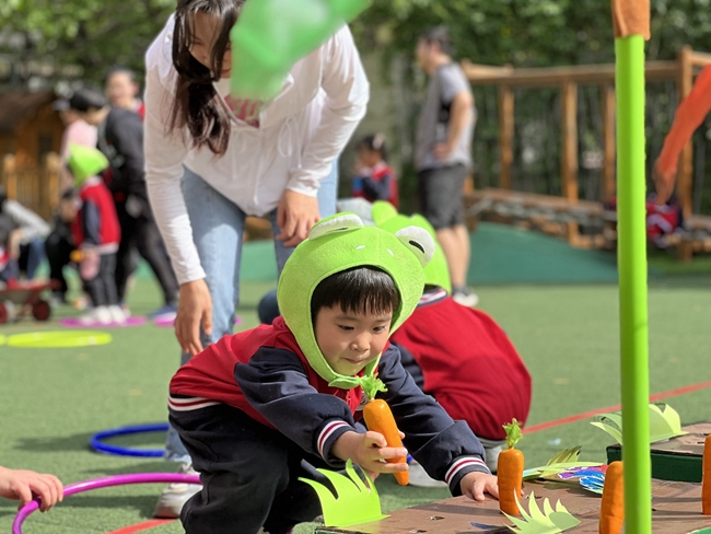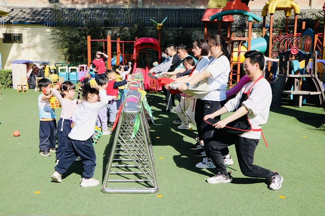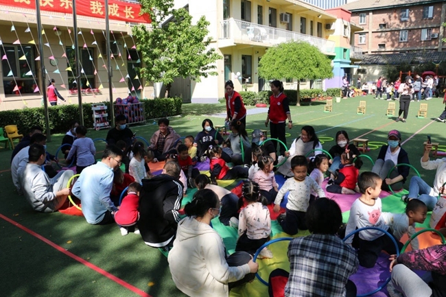 小班則是好玩的親子運(yùn)動(dòng)會(huì)。結(jié)合小班幼兒的年齡特點(diǎn),有研幼兒園設(shè)計(jì)了《母雞下蛋》《給小兔子送蘿卜》《貓和老鼠》《圍裙接球》等趣味性、互動(dòng)性強(qiáng)的親子運(yùn)動(dòng)游戲;在體驗(yàn)運(yùn)動(dòng)帶來快樂的同時(shí),既增進(jìn)了幼兒與同伴彼此之間的友誼,更增強(qiáng)了幼兒與家長(zhǎng)之間的情感交流。小運(yùn)動(dòng)員們和爸爸媽媽們一起互動(dòng)游戲,大家在歡聲笑語(yǔ)中享受著幸福的親子時(shí)光。