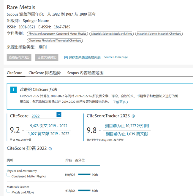 《稀有金屬(英文版)》2022 CiteScore™ 為9.2,較2021年度大幅提升67.27%,位于Metals and Alloys領(lǐng)域Q1區(qū),排名17/164,提升5名。