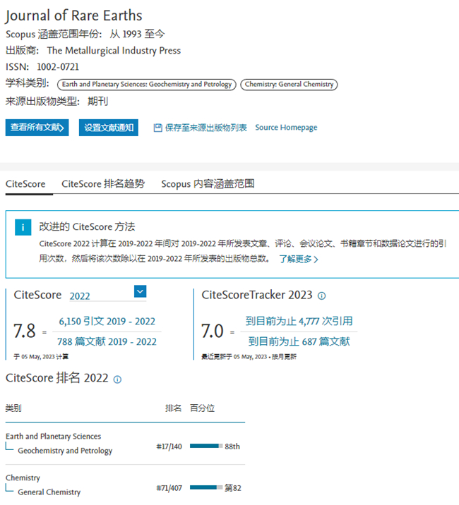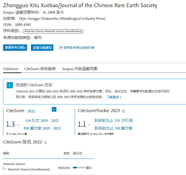 《中國稀土學報》2022年繼續(xù)保持收錄, CiteScore™為1.3,較上一年度提升18.2%,位于Q3區(qū)。