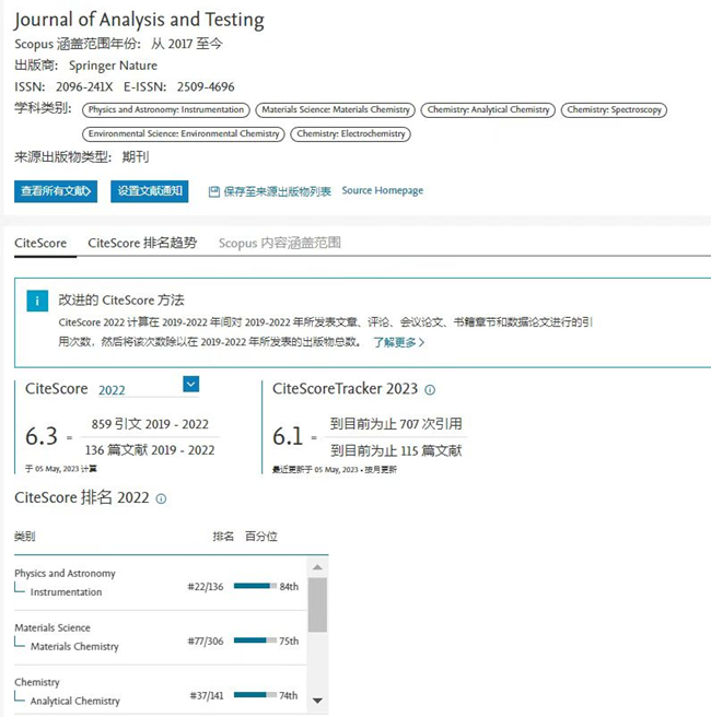 《分析檢測(英文)》2022年CiteScore™ 為6.3,較2021年度提升50%,在Instrumentation領(lǐng)域中排名22/136,提升18名,位于Q1區(qū);在Materials Chemistry領(lǐng)域中排名77/306,提升26名,位于Q1區(qū),在Analytical Chemistry領(lǐng)域中排名37/141,提升17名,位于Q2區(qū)。