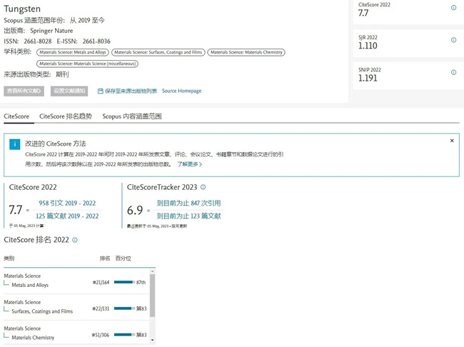 《鎢科技(英文)》在2022年首次入選CiteScore™,分數(shù)為7.7,在Metals and Alloys領(lǐng)域排名21/164,在Surfaces,Coatings and Films領(lǐng)域排名22/131,在Materials Chemistry領(lǐng)域排名51/306,在三個領(lǐng)域均入選Q1區(qū)。