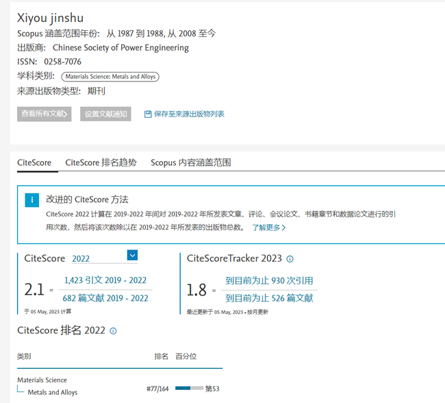 《稀有金屬》2022 CiteScore™為2.1,較2021年度提升31.25%,在Metals and Alloys領(lǐng)域中由Q3區(qū)提升至Q2區(qū),排名77/164,提升5名。