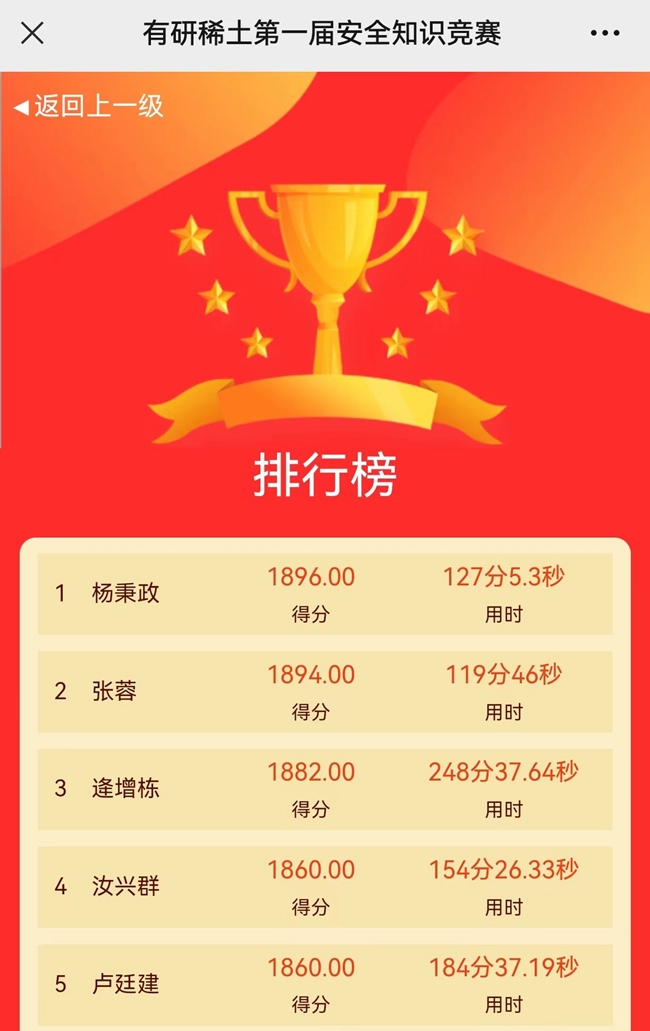競賽有始終,學習無止境。接下來,有研稀土將繼續(xù)推陳創(chuàng)新、多措并舉、持續(xù)強化安全生產(chǎn)宣傳,切實增強全體職工的安全生產(chǎn)自覺性與主動性;不斷加強崗位安全責任落實,為公司“十四五”高質(zhì)量安全發(fā)展保駕護航!