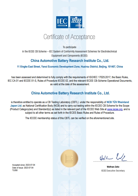 IECEE是國際電工委員會(IEC)授權(quán)的國際認(rèn)證組織,IECEE CB 體系是基于IEC標(biāo)準(zhǔn)的電工產(chǎn)品全球互認(rèn)體系。國聯(lián)研究院獲IECEE-CBTL資質(zhì),標(biāo)志其具備承接國際認(rèn)證檢測業(yè)務(wù)能力,可受理世界各國產(chǎn)品制造商的CBTL測試申請,涵蓋工業(yè)用電池產(chǎn)品(儲能系統(tǒng)、非道路車輛等)和動(dòng)力電池產(chǎn)品(道路車輛)現(xiàn)行最新標(biāo)準(zhǔn),測試報(bào)告可在IECEE各成員國間得到接受和認(rèn)可。