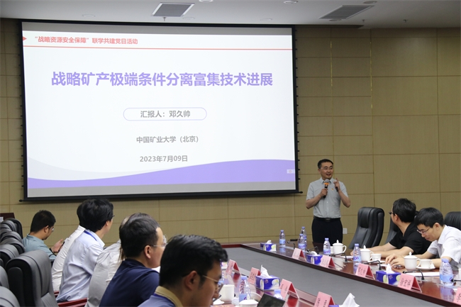 為深入開展學習貫徹習近平新時代中國特色社會主義思想主題教育,強化以學鑄魂、以學增智、以學正風、以學促干,7月9日,有研資環(huán)院第一黨支部與中國礦業(yè)大學(北京)礦加系黨支部開展“戰(zhàn)略資源安全保障”聯(lián)學共建主題黨日活動。有研資環(huán)院黨總支委員、第一黨支部書記、副總經(jīng)理溫建康,第一黨支部組織委員兼青年委員、綠色選冶事業(yè)部總經(jīng)理尚鶴,第一黨支部宣傳委員兼紀檢委員、分析測試中心主任屈偉;中國礦業(yè)大學(北京)礦加系黨支部書記張志軍、礦加系主任鄧久帥參加活動。有研資環(huán)院第一黨支部相關(guān)黨員,高品質(zhì)有色金屬綠色特種冶金國家工程研究中心部分研究生;中國礦業(yè)大學(北京)礦加系黨支部相關(guān)黨員教師,2021級本科生,共75人參加活動。