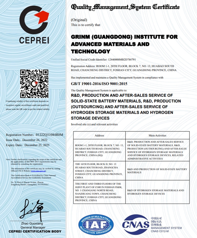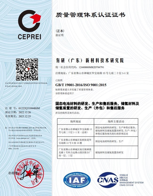 有研廣東院自2022年7月建立并實施ISO9001質(zhì)量管理體系以來,儲氫工程化團隊和固態(tài)電池團隊先后獲得ISO9001:2015質(zhì)量管理體系認(rèn)證證書,為新產(chǎn)品、新技術(shù)轉(zhuǎn)化應(yīng)用提供了重要保障。