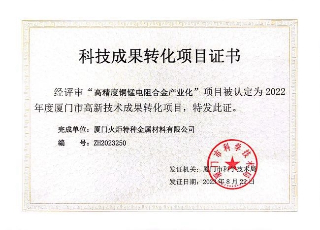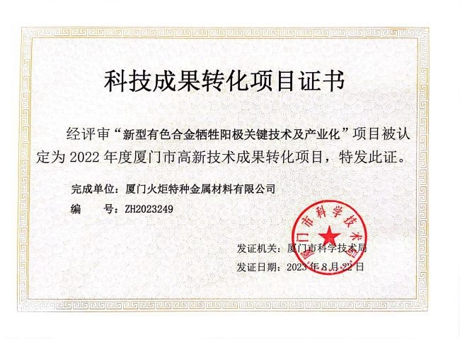 近日,火炬特材公司兩項(xiàng)科技成果“新型有色金屬犧牲陽(yáng)極關(guān)鍵技術(shù)及產(chǎn)業(yè)化”和“高精度銅錳電阻合金產(chǎn)業(yè)化”榮獲2022年度廈門市高新技術(shù)成果轉(zhuǎn)化項(xiàng)目認(rèn)定。