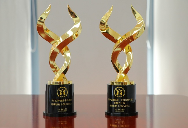11月23日至24日,由中國證券報、南通市人民政府主辦的2023上市公司高質(zhì)量發(fā)展論壇暨第二十五屆上市公司金牛獎頒獎典禮,由中國證券報、中國國新控股有限責任公司、南通市人民政府主辦的2023金牛企業(yè)可持續(xù)發(fā)展論壇暨第一屆國新杯·ESG金牛獎頒獎典禮在江蘇南通舉行。有研粉材憑借優(yōu)異的科技創(chuàng)新和金屬粉體制備領域技術優(yōu)勢等突出表現(xiàn),榮獲“2022年度金??苿?chuàng)獎”和“第一屆國新杯·ESG金牛獎新銳二十強”。