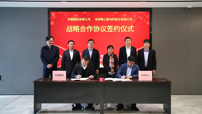 2月29日,有研稀土新材料股份有限公司與河鋼集團有限公司合作框架協(xié)議簽約儀式在有研大廈舉行。中國有研首席科學家、中國工程院院士黃小衛(wèi),中國有研副總經(jīng)理李志輝,有研新材總經(jīng)理于敦波出席會議,并與河鋼集團副總經(jīng)理李毅仁,河鋼材料技術研究院副院長劉宏強、李杰共同見證簽約。有研稀土總經(jīng)理劉榮輝、河鋼集團科技創(chuàng)新部總經(jīng)理孫曉明分別代表雙方簽署合作框架協(xié)議。
