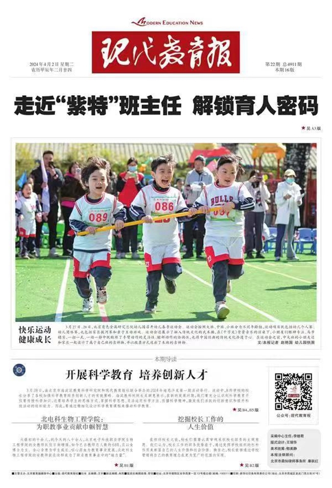 4月2日,《現(xiàn)代教育報(bào)》在第4911期頭版以“快樂運(yùn)動(dòng) 健康成長”為題,報(bào)道了北京有色金屬研究總院幼兒園春季運(yùn)動(dòng)會(huì)。報(bào)道中介紹了幼兒園按照大中小班分為不同年齡組開展個(gè)人賽、團(tuán)體賽、親子游戲、家長賽等多種運(yùn)動(dòng)項(xiàng)目,宣傳了運(yùn)動(dòng)會(huì)中融入了中華傳統(tǒng)文化武術(shù)操等特色項(xiàng)目。