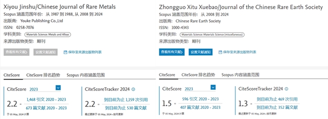 入選中文刊實現(xiàn)穩(wěn)步提升?!断∮薪饘佟?023年度CiteScore™為2.2,同比提升4.76%,位于Metals and Alloys領域Q2區(qū),排名80/176?!吨袊⊥翆W報》2023年度CiteScore™為1.5,同比提升15.38%,位于Materials Science領域Q3區(qū),排名127/196。