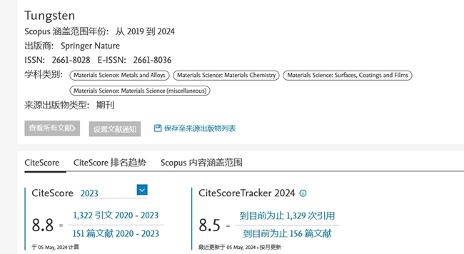 《鎢科技(英文)》2023年度CiteScore™為8.8,自首次入選以來同比提升14.29%,在4個領域位于Q1區(qū),其中在Metals and Alloys領域排名20/176(前20%);在Materials Chemistry領域排名52/317(前20%);在Surfaces,Coatings and Films領域排名22/132(前20%);在Materials Science(miscellaneous)領域排名34/196(前20%)。
