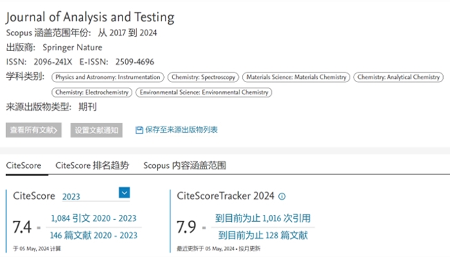 《分析檢測(英文)》2023年度CiteScore™為7.4,同比提升17.46%,在4個領域位于Q1區(qū),其中在Analytical Chemistry領域排名35/156(前25%);在Instrumentation領域排名23/141(前20%);在Spectroscopy領域排名14/76(前20%);在Material Chemistry領域排名70/317(前25%)。