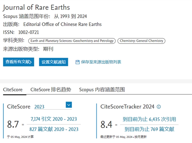 《稀土學報(英文版)》2023年度CiteScore™為8.7,同比提升11.54%,雙Q1區(qū),其中在Geochemistry and Petrology領域排名12/154(前10%),提升5名;在General Chemistry領域排名69/408(前20%),提升2名。