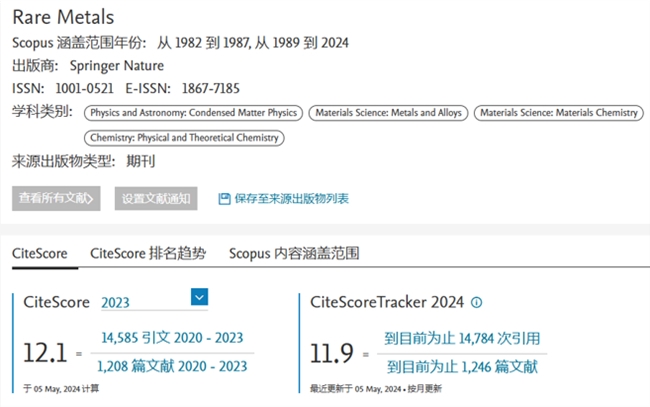《稀有金屬(英文版)》2023年度CiteScore™為12.1,同比提升31.52%,繼續(xù)保持高位增長,在4個領域位于Q1區(qū),排名全部位于所屬領域前10%,其中在Metals and Alloys領域排名11/176(前10%),提升6名;在Physical and Theoretical Chemistry領域排名17/189(前10%),提升8名;在Condensed Matter Physics領域排名23/434(前10%),提升17名;在Materials Chemistry領域排名24/317(前10%),提升13名。