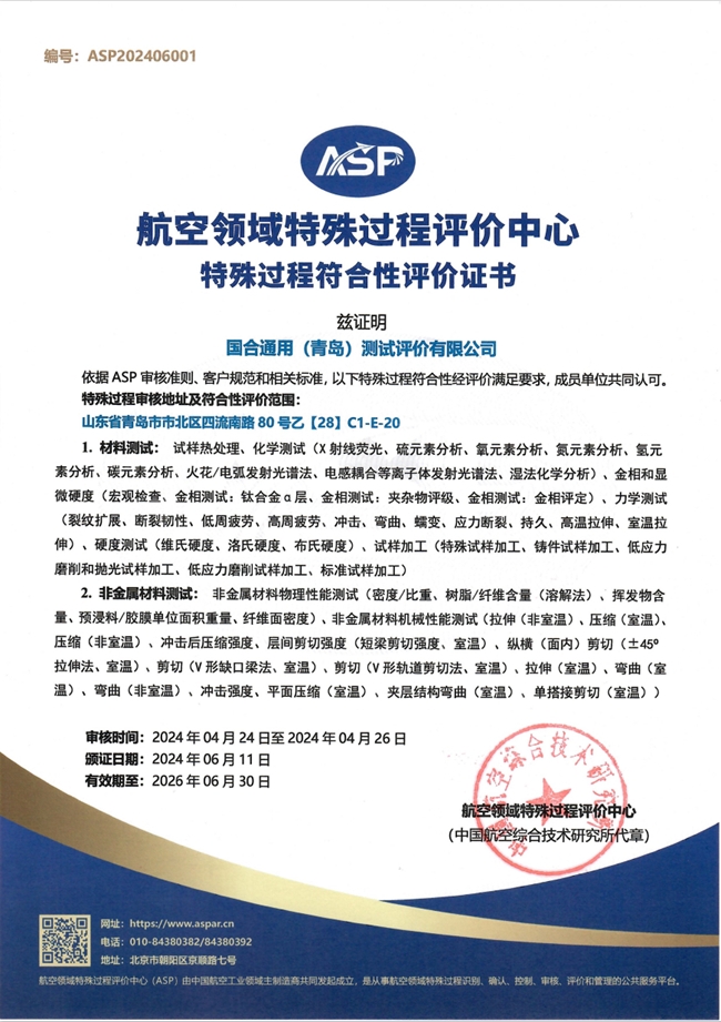 2024年6月11日,國合青島通過航空領(lǐng)域特殊過程評價中心評審,獲得航空領(lǐng)域特殊過程符合性評價認證(Aviation Special Process Review Center),成為同時擁有ASP金屬材料測試及非金屬材料測試的檢測機構(gòu)。自成立以來,國合青島已相繼取得CMA、CNAS、NADCAP( MTL、NMMT)、AECC(MTL)、ASP( MTL、NMMT)等檢測資質(zhì),逐漸成為國內(nèi)航空材料檢測資質(zhì)覆蓋最全的機構(gòu)之一。