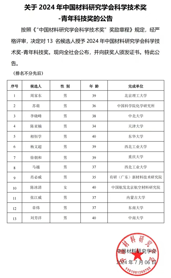 7月6日,中國(guó)材料研究學(xué)會(huì)發(fā)布了《關(guān)于2024年中國(guó)材料研究學(xué)會(huì)科學(xué)技術(shù)獎(jiǎng)—青年科技獎(jiǎng)的公告》,全國(guó)共有13人被授予2024年中國(guó)材料研究學(xué)會(huì)科學(xué)技術(shù)獎(jiǎng)—青年科技獎(jiǎng),有研廣東院肖必威博士成功入選,并受邀參加了7月9日中國(guó)材料大會(huì)2024暨第二屆世界材料大會(huì)頒獎(jiǎng)儀式。