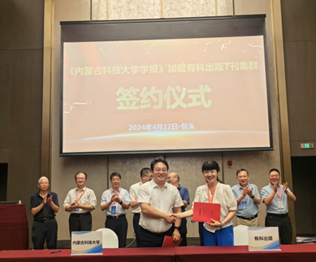 會(huì)上還舉行了《內(nèi)蒙古科技大學(xué)學(xué)報(bào)》加盟有科出版工程技術(shù)期刊集群(T刊集群)簽約儀式。內(nèi)蒙古科技大學(xué)副校長(zhǎng)張新房與錢九紅代表雙方簽署協(xié)議。中國(guó)科學(xué)院院士蔣成保,中國(guó)稀土學(xué)會(huì)理事長(zhǎng)李波,中國(guó)鋼研科技集團(tuán)有限公司黨委常委、副總經(jīng)理趙棟梁,天津工業(yè)大學(xué)校長(zhǎng)姜勇,包頭稀土研究院院長(zhǎng)嚴(yán)密,安徽大學(xué)副校長(zhǎng)王守國(guó),北京科技大學(xué)教授于廣華,內(nèi)蒙古科技大學(xué)學(xué)報(bào)編輯部相關(guān)負(fù)責(zé)人共同見證。本次簽約是內(nèi)蒙古自治區(qū)高校學(xué)報(bào)加盟期刊集群的首次嘗試,是出版企業(yè)與高校在科技期刊領(lǐng)域深度融合的重要實(shí)踐。雙方將在整合共享優(yōu)質(zhì)學(xué)術(shù)出版資源、構(gòu)建高端學(xué)術(shù)交流平臺(tái)等方面共同發(fā)力,以實(shí)際行動(dòng)踐行“把論文寫在祖國(guó)的大地上”。