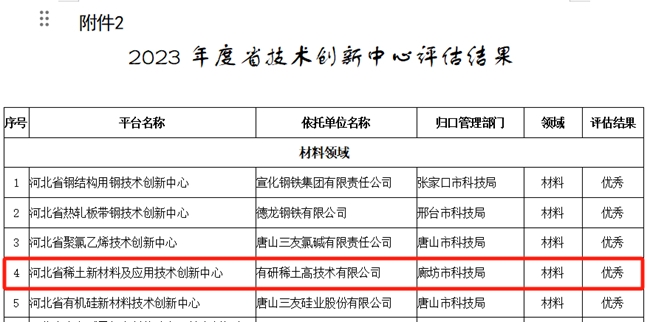 日前,河北省科技廳發(fā)布了《關(guān)于公布2023年度省重點實驗室、技術(shù)創(chuàng)新中心績效評估與驗收工作結(jié)果的通知》,依托有研稀土公司建設(shè)的“河北省稀土新材料及應(yīng)用技術(shù)創(chuàng)新中心”(以下簡稱中心)在2023年度績效評估中被評為“優(yōu)秀”。