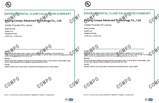 近日,康普錫威Solder Powder RC1 Series(Sn-Ag-Cu錫焊粉系列)和Solder Powder RC2 Series(Sn-Bi-Ag錫焊粉系列)產(chǎn)品通過全球知名認(rèn)證公司UL Solutions嚴(yán)格的資料及生產(chǎn)現(xiàn)場審核,喜獲UL 2809標(biāo)準(zhǔn)的再生含量驗(yàn)證證書。此證書也是國內(nèi)錫焊粉行業(yè)首張UL 2809驗(yàn)證證書。
