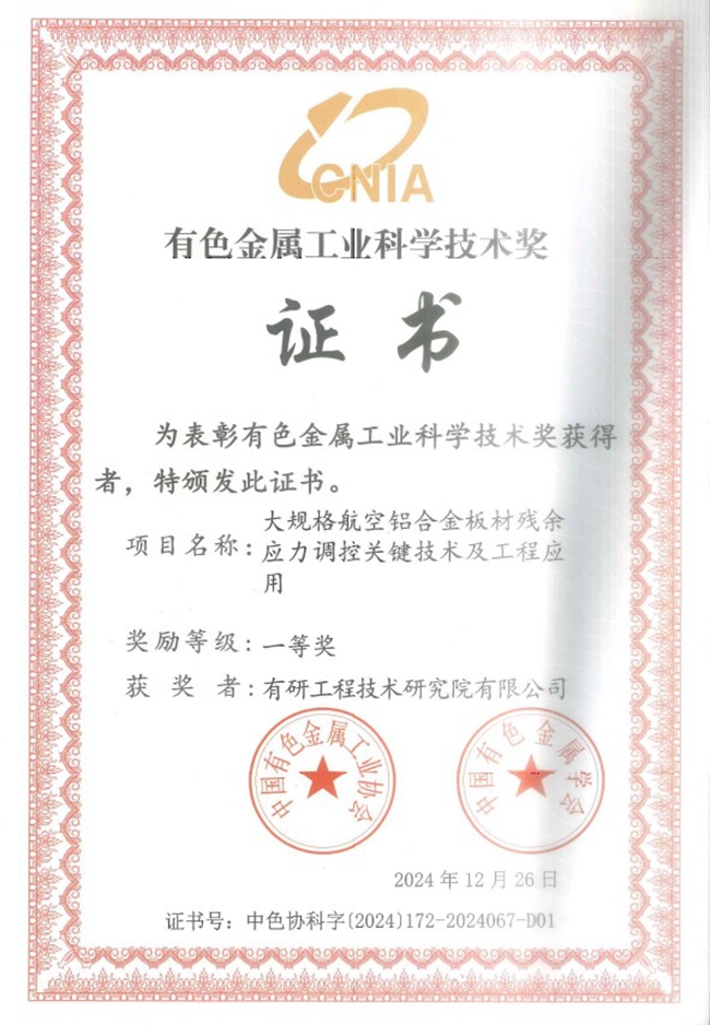 近日,中國(guó)有色金屬工業(yè)協(xié)會(huì)、中國(guó)有色金屬學(xué)會(huì)聯(lián)合發(fā)布了《關(guān)于頒發(fā)2024年度中國(guó)有色金屬工業(yè)科學(xué)技術(shù)獎(jiǎng)的通知》,有研工研院結(jié)構(gòu)事業(yè)部主持完成的《大規(guī)格航空鋁合金板材殘余應(yīng)力調(diào)控關(guān)鍵技術(shù)及工程應(yīng)用》項(xiàng)目榮獲中國(guó)有色金屬工業(yè)科學(xué)技術(shù)獎(jiǎng)一等獎(jiǎng)。
