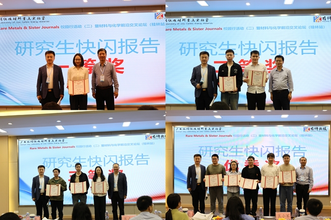 侯仰龍為Rare Metals期刊2025年新聘任學術副主編、青年編委頒發(fā)了聘書。來自13所高校和科研院所的學者圍繞會議主題,對相關領域研究進展及未來應用展望作專題報告。參會師生踴躍提問、互動熱烈。來自廣西師范大學、桂林電子科技大學、桂林理工大學的11位研究生分享了所負責研究課題的 “快閃報告”,贏得了評委和觀眾的一致好評。