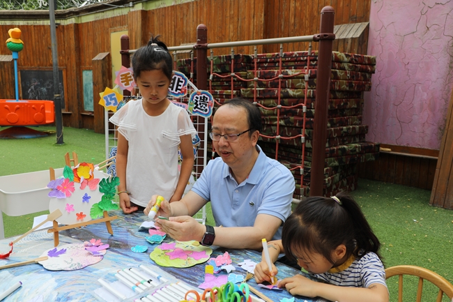毛昌輝一行先后走進幼兒園多功能廳、戶外活動場地,來到孩子們身邊,觀看了“古詩吟唱”“巧手探非遺”“跳竹竿舞”“面部彩繪”等豐富多彩的迎“六一”活動,并參與了“非遺團扇制作”,和孩子們一起歡慶節(jié)日。