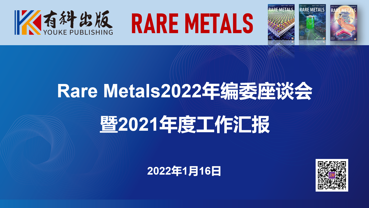 1月16日,有研集團(tuán)主辦期刊《稀有金屬(英文版)》2022年編委座談會暨2021年度工作匯報在線上線下同步召開。副主編北京大學(xué)侯仰龍教授、清華大學(xué)林元華教授、北京航空航天大學(xué)蔣成保教授、青年編委及編輯部成員共100余人出席會議。會議由有科出版總經(jīng)理錢九紅主持。
