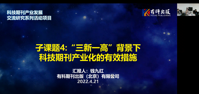 4月21日,有科出版順利入選“‘學清刊壇’(第二期)—科技期刊產(chǎn)業(yè)發(fā)展交流研究系列活動”項目。由中國科協(xié)學會服務(wù)中心主辦,同方知網(wǎng)(北京)技術(shù)有限公司承辦的“‘學清刊壇’(第二期)—科技期刊產(chǎn)業(yè)發(fā)展交流研究系列活動”項目顧問委員會第一次會議在線上召開。董爾丹院士、黃小衛(wèi)院士、劉文清院士、中國有色金屬學會理事長賈明星及業(yè)內(nèi)專家學者共計59人參會。有科出版承擔了“學清刊壇(第一期)”子課題“中國科技期刊產(chǎn)業(yè)化發(fā)展戰(zhàn)略研討”并圓滿完成了相關(guān)活動,“學清刊壇(第二期)”子課題“三新一高”背景下科技期刊產(chǎn)業(yè)化的有效措施的研究”再次由有科出版承擔,董事長、總經(jīng)理錢九紅出席并匯報今年的工作計劃和進度情況。