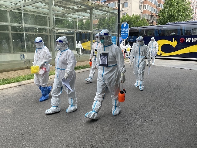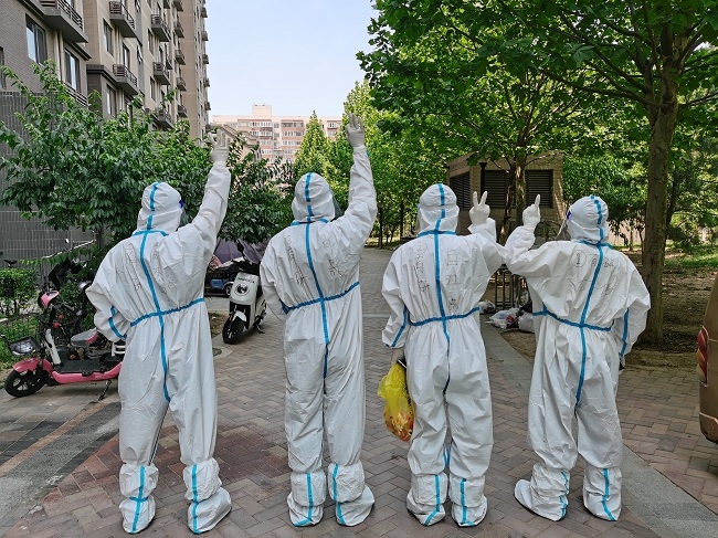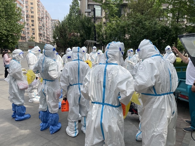 上午8點(diǎn)許,志愿者們集合完畢。按照社區(qū)工作安排,入戶采樣工作陸續(xù)開(kāi)始。志愿者們配合核酸檢測(cè)醫(yī)務(wù)人員,挨家挨戶敲門(mén)通知、收還身份證、細(xì)心進(jìn)行身份登記,每棟樓、每個(gè)單元、每一樓層、每個(gè)人,確保無(wú)一遺漏。當(dāng)天北京的最高氣溫到達(dá)32℃,志愿者和醫(yī)務(wù)人員們身著密不透風(fēng)的防護(hù)服,任憑衣物被汗水浸透、面罩被水汽模糊,卻始終堅(jiān)守在志愿崗位上,盡職盡責(zé)地完成自己的工作使命。許多志愿者們顧不上吃早飯,一直堅(jiān)持空腹工作到下午3點(diǎn)。
