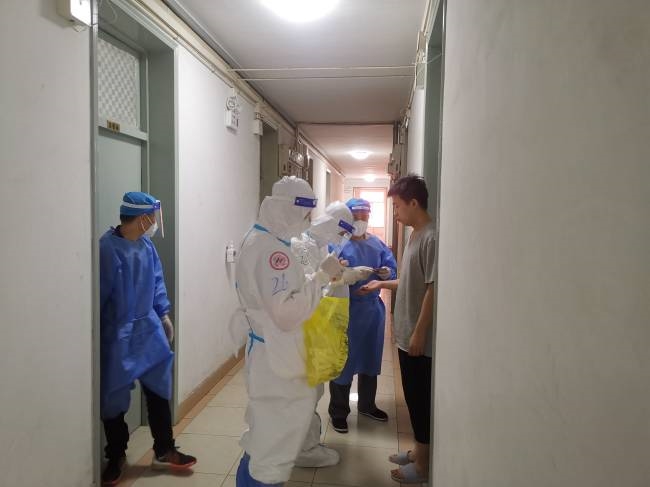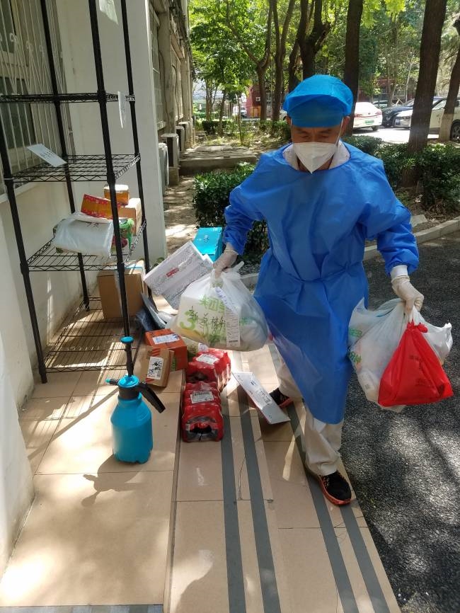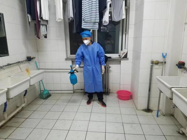 在北太園區(qū),9:00,北太園區(qū)工作人員協(xié)助核酸檢測(cè)人員為單身公寓的學(xué)生進(jìn)行檢測(cè);10:30,工作人員對(duì)單身公寓的快遞外賣進(jìn)行消殺轉(zhuǎn)運(yùn);14:00,工作人員對(duì)單身公寓公共區(qū)域進(jìn)行日常消殺,小區(qū)封控以來(lái),北太園區(qū)職工每?jī)尚r(shí)對(duì)公共區(qū)域進(jìn)行一次消殺;17:00,工作人員對(duì)單身公寓垃圾進(jìn)行消毒后進(jìn)行處理。