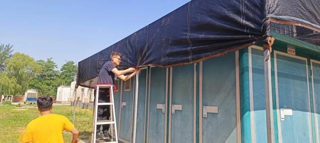 在懷柔園區(qū), 8:00,總配電室值班人員檢查配電設(shè)備運(yùn)行狀態(tài);9:00,工作人員為職工進(jìn)行核酸采樣;10:30,工作人員疏通廚房下水管道;11:00,保潔人員擦拭大門(mén)玻璃;13:30,工作人員維修損壞管件;14:00,保潔人員清理步道雜草;15:00,保潔人員清理消毒垃圾桶;15:30,綠化工作人員打理草坪;16:00,餐飲工作人員分裝職工晚餐。