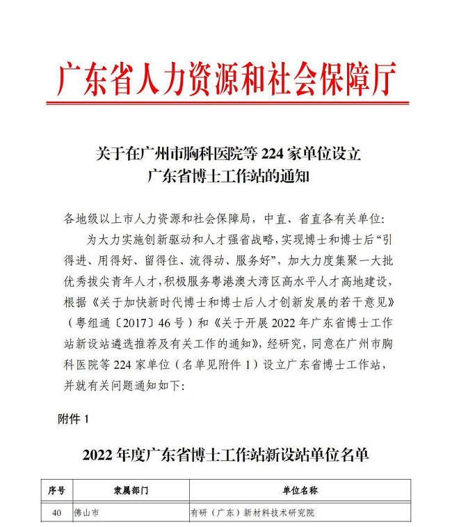 根據廣東省人力資源和社會保障廳發(fā)布的《關于在廣州市胸科醫(yī)院等224家單位設立廣東省博士工作站的通知》,有研廣東院成功獲批設立廣東省博士工作站。