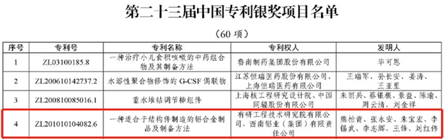 近日,國家知識產(chǎn)權(quán)局發(fā)布了《國家知識產(chǎn)權(quán)局關(guān)于第二十三屆中國專利獎授獎的決定》,有研集團(tuán)有研工研院主持完成的發(fā)明專利“一種適合于結(jié)構(gòu)件制造的鋁合金制品及制備方法”獲得第二十三屆中國專利銀獎。