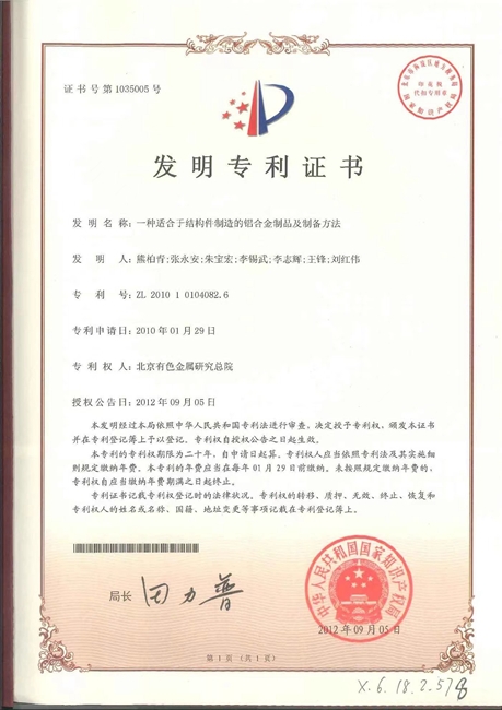 該項(xiàng)發(fā)明于2012年9月獲國家知識產(chǎn)權(quán)局授予發(fā)明專利權(quán)(專利號為201010104082.6),并在美國、日本、歐洲等11個國外航空鋁材主要生產(chǎn)制造國獲得授權(quán)。該專利可實(shí)現(xiàn)大厚度高性能鋁合金板材和鍛件等產(chǎn)品的生產(chǎn)制造,產(chǎn)品綜合性能全面達(dá)到國際國內(nèi)相關(guān)標(biāo)準(zhǔn)要求,且部分關(guān)鍵指標(biāo)優(yōu)于國外同類產(chǎn)品實(shí)物,填補(bǔ)了國內(nèi)空白,解決了“卡脖子”問題,實(shí)現(xiàn)了航空領(lǐng)域核心關(guān)鍵材料自主可控。
