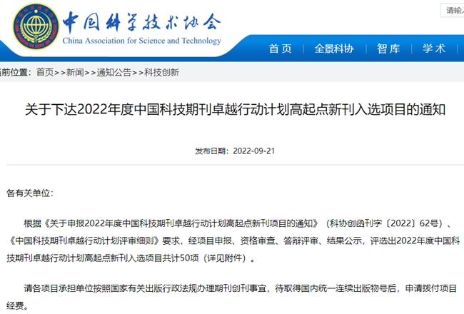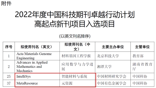 9月21日,中國(guó)科學(xué)技術(shù)協(xié)會(huì)(簡(jiǎn)稱(chēng)中國(guó)科協(xié))發(fā)布了《關(guān)于下達(dá)2022年度中國(guó)科技期刊卓越行動(dòng)計(jì)劃高起點(diǎn)新刊入選項(xiàng)目的通知》,有科出版組織申報(bào)的《智能材料與系統(tǒng)》(IntelliSys)和《元資源》(MetaResource)兩個(gè)項(xiàng)目皆成功入選。2022年度中國(guó)科技期刊卓越行動(dòng)計(jì)劃高起點(diǎn)新刊項(xiàng)目共計(jì)50項(xiàng)入選。