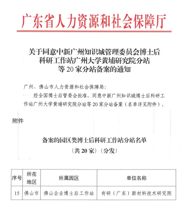 根據(jù)廣東省人力資源和社會(huì)保障廳發(fā)布的《關(guān)于同意中新廣州知識(shí)城管理委員會(huì)博士后科研工作站廣州大學(xué)黃埔研究院分站等20家分站備案的通知》,有研廣東院成功獲批設(shè)立佛山企業(yè)博士后工作站分站。
