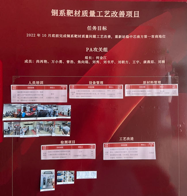 為全力保障銅系靶材質(zhì)量工藝改善,專項工作領(lǐng)導(dǎo)小組下設(shè)“PA攻關(guān)組”,宣傳委員何金江為第一責(zé)任人,攻關(guān)組從人員、設(shè)備、原材料、環(huán)境和工藝等方面著手,改善銅系靶材生產(chǎn)工藝。