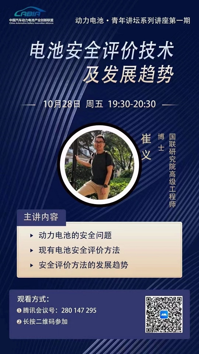 10月28日,國(guó)聯(lián)研究院組織開(kāi)展“動(dòng)力電池•青年講壇”第一期專題講座,國(guó)聯(lián)研究院檢測(cè)事業(yè)部系統(tǒng)及安全可靠檢測(cè)中心經(jīng)理崔義博士以線上直播的方式作報(bào)告,分享交流動(dòng)力電池安全評(píng)價(jià)技術(shù)及發(fā)展趨勢(shì)。本期講座有來(lái)自企業(yè)、行業(yè)機(jī)構(gòu)、科研院所等專業(yè)人士300余人線上參與講座直播,交流探討安全有關(guān)技術(shù)問(wèn)題及評(píng)價(jià)方法,達(dá)成了互促共進(jìn)、共同提升的效果,為動(dòng)力電池安全評(píng)價(jià)與性能改善提供思路。
