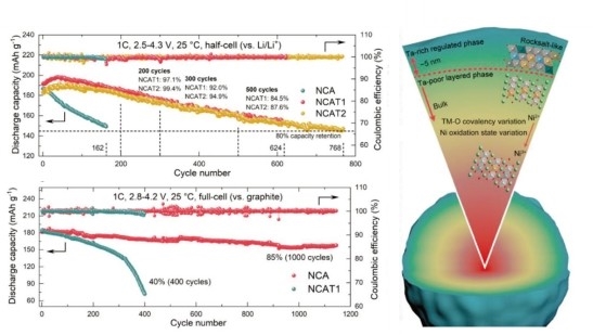國家動力電池創(chuàng)新中心創(chuàng)新團(tuán)隊(duì)牢記以技術(shù)創(chuàng)新引領(lǐng)行業(yè)高質(zhì)量發(fā)展使命,保持深耕細(xì)作、求真務(wù)實(shí)科研作風(fēng),圍繞行業(yè)共性技術(shù)需求,不斷提升技術(shù)服務(wù)能力,服務(wù)新能源汽車行業(yè)應(yīng)用需求。針對高比能動力電池在安全、壽命、成本等方面存在的問題,創(chuàng)新團(tuán)隊(duì)通過多維度調(diào)研分析,找準(zhǔn)共性問題,開展電池檢測驗(yàn)證、機(jī)理解析,確定關(guān)鍵技術(shù)因素。經(jīng)過多輪次研討,從電池關(guān)鍵材料著手,精細(xì)設(shè)計(jì)核殼梯度正極材料結(jié)構(gòu),引入電子態(tài)摻雜技術(shù),開發(fā)表面改性新方法。經(jīng)過一年多的技術(shù)攻關(guān),從材料設(shè)計(jì)、實(shí)驗(yàn)研究驗(yàn)證到工程化技術(shù)開發(fā),批量試制成功性能優(yōu)異的高鎳正極材料。所開發(fā)材料兼顧了穩(wěn)定表面結(jié)構(gòu)、良好電荷傳遞性能,具備優(yōu)異的熱穩(wěn)定性和循環(huán)穩(wěn)定性,實(shí)現(xiàn)低成本工程化,行業(yè)專家鑒定達(dá)到國際先進(jìn)水平。部分研究成果以論文形式發(fā)表于能源領(lǐng)域國際頂級學(xué)術(shù)期刊Small (IF=15.153), 題目為“Structure and Charge Regulation Strategy Enabling Superior Cyclability for Ni-Rich Layered Cathode Materials”。