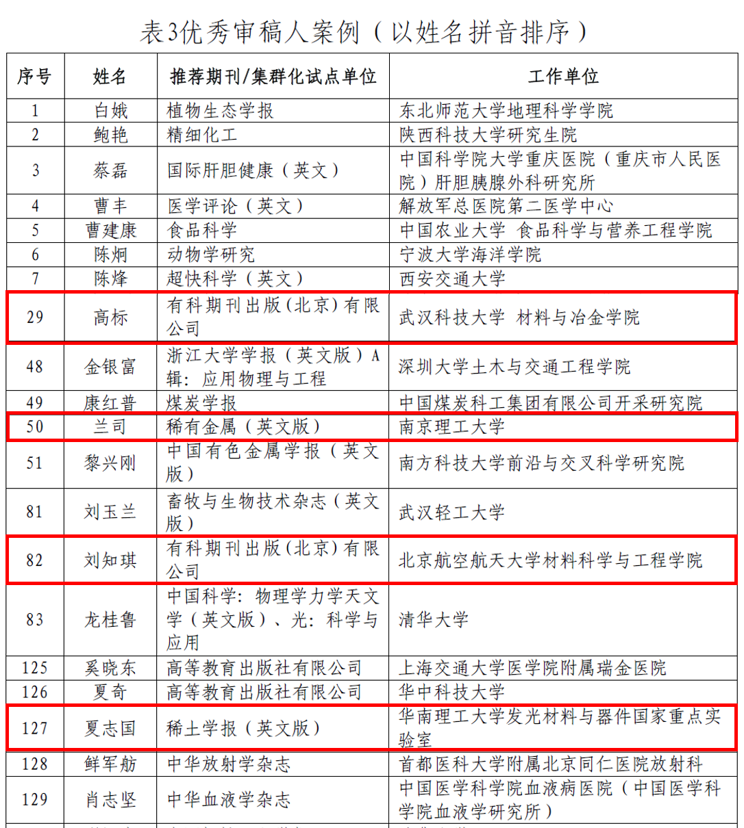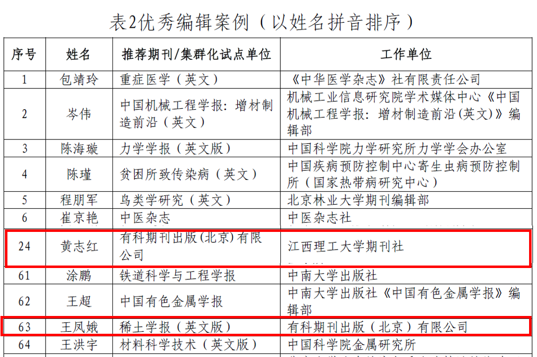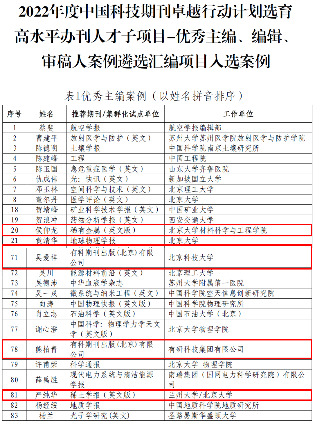 11月18日,中國科學技術(shù)協(xié)會發(fā)布了2022年度中國科技期刊卓越行動計劃優(yōu)秀主編、優(yōu)秀編輯、優(yōu)秀審稿人入選名單,經(jīng)有科出版、《稀有金屬(英文版)》、《稀土學報(英文版)》推薦,中國科學院院士、蘭州大學校長、《稀土學報(英文版)》主編嚴純?nèi)A,中國有研科技集團有限公司總經(jīng)理、《稀有金屬》主編、《稀有金屬(英文版)》執(zhí)行副主編熊柏青,北京大學教授、《稀有金屬(英文版)》副主編侯仰龍,北京科技大學教授、《礦物冶金與材料學報(英文版)》主編吳愛祥當選優(yōu)秀主編;江西理工大學期刊社社長黃志紅,《稀土學報(英文版)》編輯部主任王鳳娥入當選優(yōu)秀編輯;武漢科技大學教授高標,南京理工大學教授蘭司,北京航空航天大學教授劉知琪,華南理工大學教授夏志國當選優(yōu)秀審稿人。