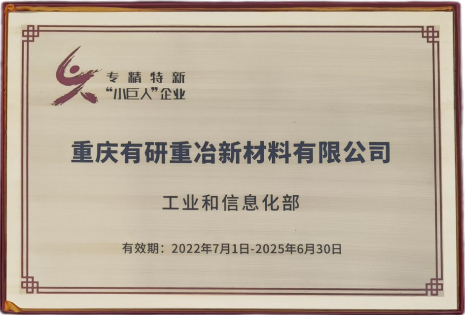 近期,有研重冶被工業(yè)和信息化部正式授予第四批國家級專精特新“小巨人”企業(yè)稱號,是公司2022年相繼獲得國家級高新技術(shù)企業(yè)、重慶市企業(yè)技術(shù)中心、重慶市知識產(chǎn)權(quán)優(yōu)勢企業(yè)、重慶市“專精特新”中小企業(yè)、重慶新材料研發(fā)制造先進(jìn)企業(yè)等稱號后的又一好消息。