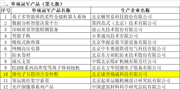 此前,由工業(yè)和信息化部、中國工業(yè)經(jīng)濟聯(lián)合會組織開展的第七批制造業(yè)單項冠軍企業(yè)(產(chǎn)品)培育遴選工作已完成相關審核并公示獲評企業(yè)名單,有研粉材所屬公司康普錫威研發(fā)的“微電子互連用合金焊粉”獲評國家第七批制造業(yè)單項冠軍產(chǎn)品。此外,作為首批國家級專精特新“小巨人”企業(yè),康普錫威通過復核。