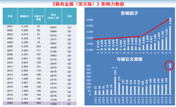 博觀約取,厚積薄發(fā)。2001年,期刊被美國(guó)《科學(xué)引文索引》SCIE收錄,其后期刊影響因子和影響力穩(wěn)步提高,特別是近十年,影響因子呈飛躍式攀升:從0.493穩(wěn)步提升至4.003,增長(zhǎng)8倍,發(fā)文量從119篇增加到349篇;2019年首次進(jìn)入國(guó)際冶金工程類Q1區(qū),成為中國(guó)81本Q1區(qū)期刊之一;2020年度影響因子在中國(guó)大陸265本SCI收錄期刊中排第96位、冶金工程領(lǐng)域中國(guó)大陸11種期刊中排第3位;2020年度發(fā)文量在中國(guó)大陸265本SCI收錄期刊中排第16位、冶金工程領(lǐng)域中國(guó)大陸11種期刊中排第3位。期刊影響因子和發(fā)文量實(shí)現(xiàn)雙增長(zhǎng),是一流科技期刊一流學(xué)術(shù)平臺(tái)初期探索與實(shí)踐的成功案例。此外,《稀有金屬(英文版)》獲得多項(xiàng)行業(yè)獎(jiǎng)項(xiàng),入選中國(guó)科技期刊卓越行動(dòng)計(jì)劃,獲評(píng)國(guó)家新聞出版局首屆全國(guó)百?gòu)?qiáng)報(bào)刊、中國(guó)科協(xié)優(yōu)秀國(guó)際科技期刊獎(jiǎng)、中國(guó)最具國(guó)際影響力學(xué)術(shù)期刊(連續(xù)9年)、“有色金屬領(lǐng)域科技期刊高質(zhì)量分級(jí)目錄”T1級(jí)別期刊、中國(guó)有色金屬出版物獎(jiǎng)(連續(xù)4次)、中國(guó)科協(xié)主管科技期刊審讀優(yōu)級(jí)期刊等。