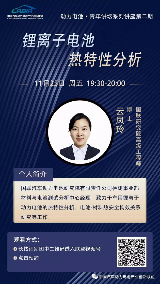 國家動(dòng)力電池創(chuàng)新中心“動(dòng)力電池·青年講壇”系列講座繼續(xù)開講,11月25日,講座第二期順利上線。本期講座采取視頻號直播形式,邀請國聯(lián)研究院檢測事業(yè)部云鳳玲博士專題分享鋰離子電池?zé)崽匦苑治鲅芯砍晒?。來自行業(yè)企業(yè)、高校的青年學(xué)者近300人參與互動(dòng)交流,探討鋰離子電池?zé)崽匦苑治雠c電池安全設(shè)計(jì)的關(guān)系、熱特性參數(shù)相關(guān)檢測方法等技術(shù)問題,為鋰離子電池安全性能的改善提供思路,取得了互促共進(jìn)、共同提升的效果。