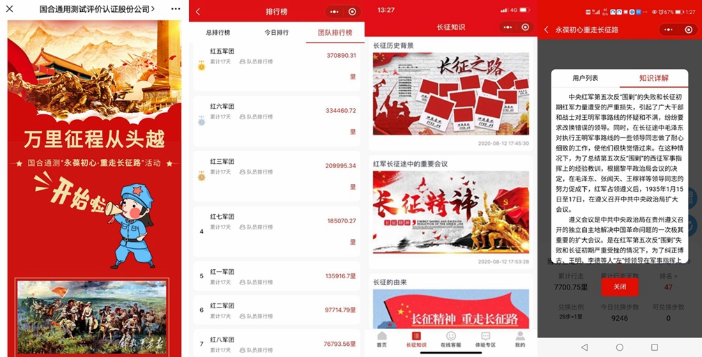 自3月15日起,國合通測7個黨支部分別命名為紅軍長征中的7個軍團,以每日線下行走步數(shù)兌換線上里程,力爭七一前人均走完25000里(行軍標準為每日人均至少7100步)。同時通過“重走長征路”程序,專題學習黨史知識。每到達紅軍長征標志性地點,可點擊彈框學習相關知識。