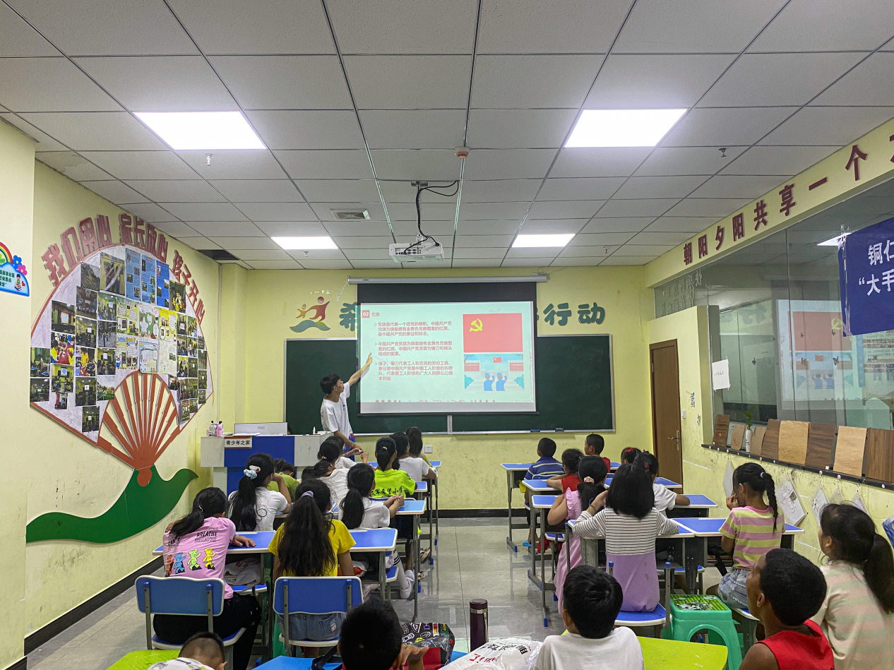 青少年是國家的未來和民族的希望,為引導(dǎo)青少年在學(xué)史明理、學(xué)史增信、學(xué)史崇德、學(xué)史力行中厚植愛國主義情懷,8月初,有研集團研究生支教團緊隨建黨百年學(xué)習(xí)黨史的熱潮,圍繞“學(xué)黨史、感黨恩、跟黨走”這一主題,在有研集團研究生支教基地——貴州省思南縣麗景社區(qū)為孩子們上了一堂特殊的思政課。本堂思政課內(nèi)容涵蓋了學(xué)習(xí)習(xí)近平總書記在慶祝中國共產(chǎn)黨成立100周年大會上的重要講話、講述優(yōu)秀共產(chǎn)黨員先進事跡、介紹黨旗黨徽等黨史知識及紅色節(jié)日,學(xué)習(xí)形式包括課件講解、視頻觀看、繪畫教學(xué)等。