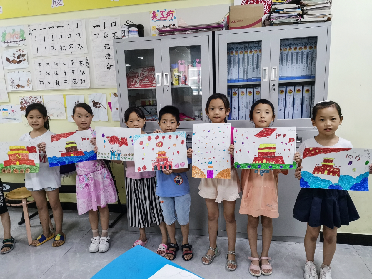 思政課最后,研究生支教團給孩子們上了一節(jié)“感黨恩,跟黨走”主題繪畫課。孩子們有的用畫筆畫出了鮮紅的國旗、金色的黨徽和五角星,有的畫出了雄偉的天安門,還有的為黨的百年生日畫出了蛋糕……畫筆是孩子想象力的翅膀,也是孩子表達心愿的風(fēng)帆,這一幅幅畫正是他們?yōu)辄h的100歲生日獻上的真摯賀禮。